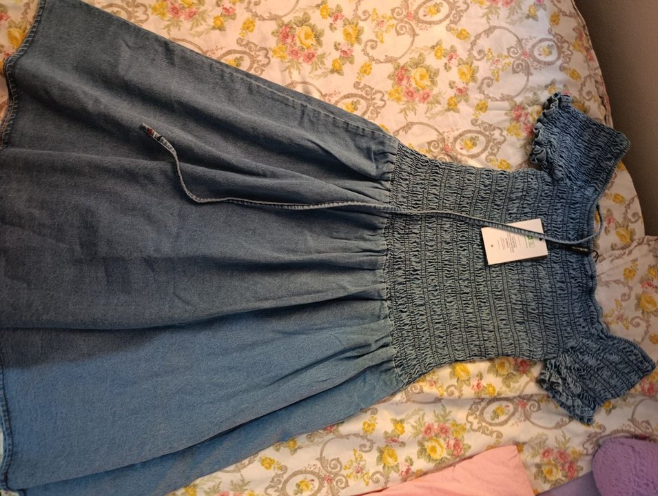 Nakışlı detaylara ve kemere sahip, bol kesim uzun hamile kot elbise. Canlı mavi renkte, günlük kullanıma uygun bohem tarz.
