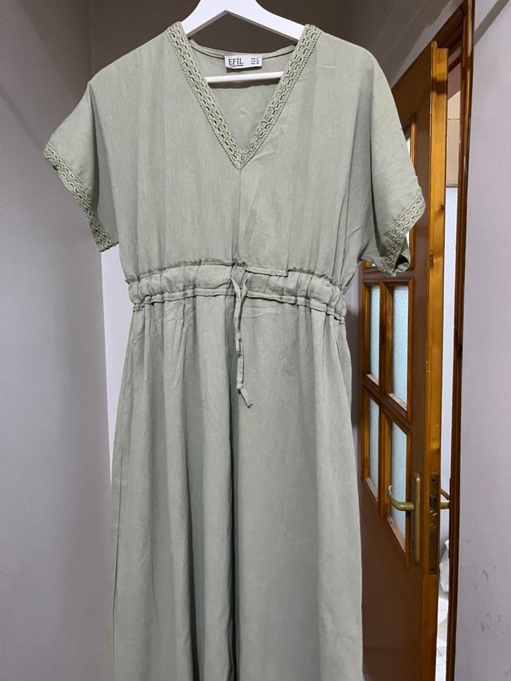 Bej keten kumaştan, nakış detaylı, V yaka, kısa kollu, kemerli ve bol kesim bohem tarz elbise. Minimalist görünüm sağlar, günlük kullanıma uygundur.