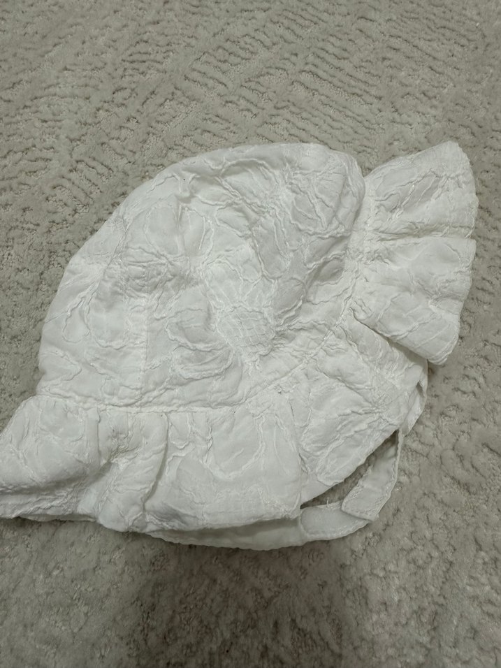 Nakışlı desenlere ve fırfır detaylara sahip beyaz keten çocuk şapkası, bohem tarzda. Yumuşak ve nefes alabilen kumaş rahatlık sağlar.