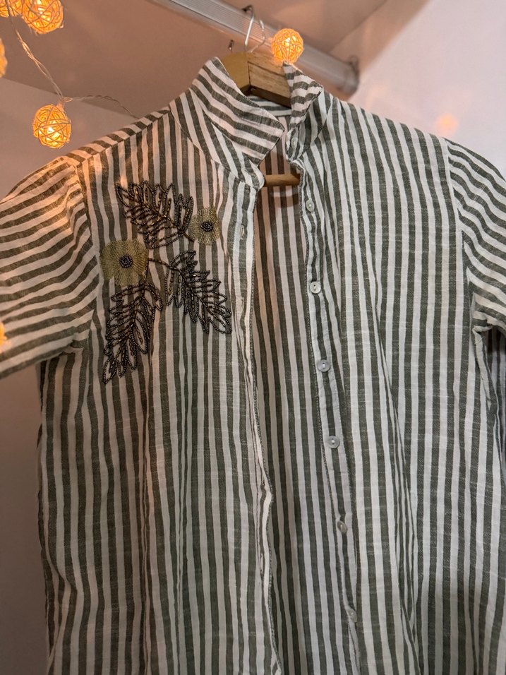 Bej ve gri çizgili keten gömlek, kısa kollu ve yakalıdır. Nakışlı çiçek detayları ve düğmeli ön kısmı ile bohem tarz sunar.