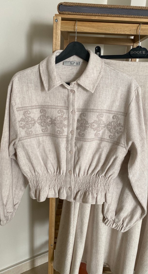 Bej keten kumaştan, uzun kollu, düğmeli ve nakış detaylı kısa kesim gömlek. Salaş ve vintage bohem tarzına uygun. Etekli takımdır