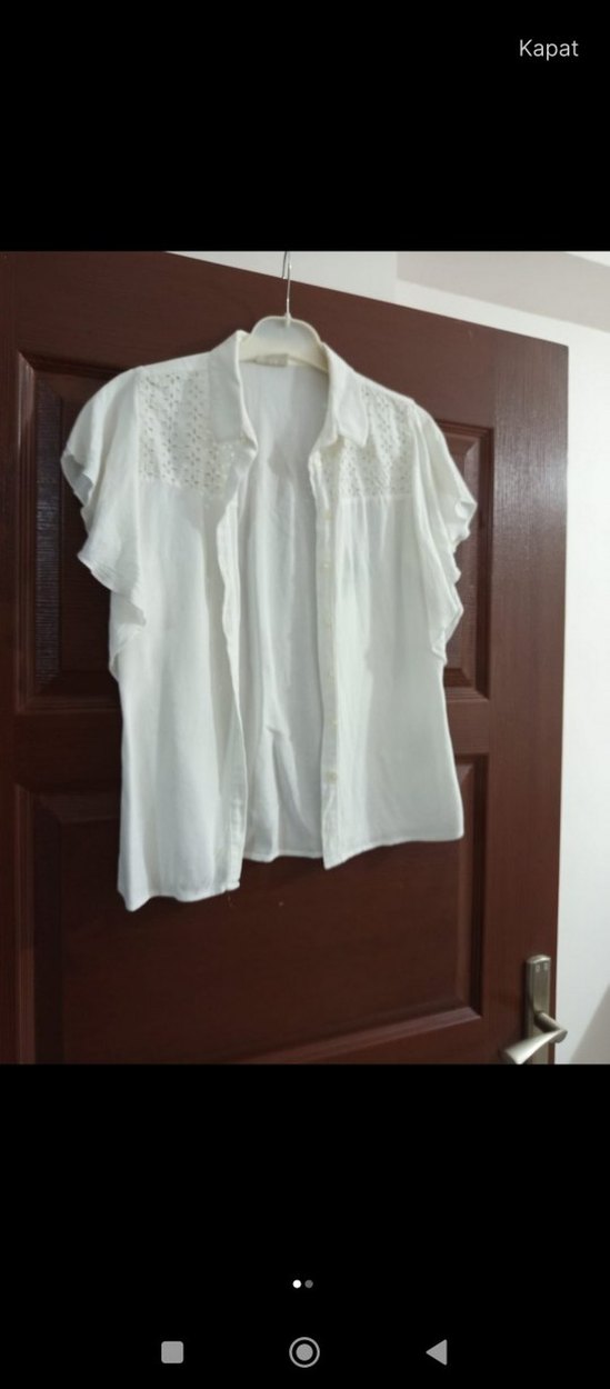 Nakışlı detaylara sahip, kısa kollu, V yakalı beyaz keten gömlek, bol kesim ve düğmeli ön tasarımla bohem tarzı için uygun.