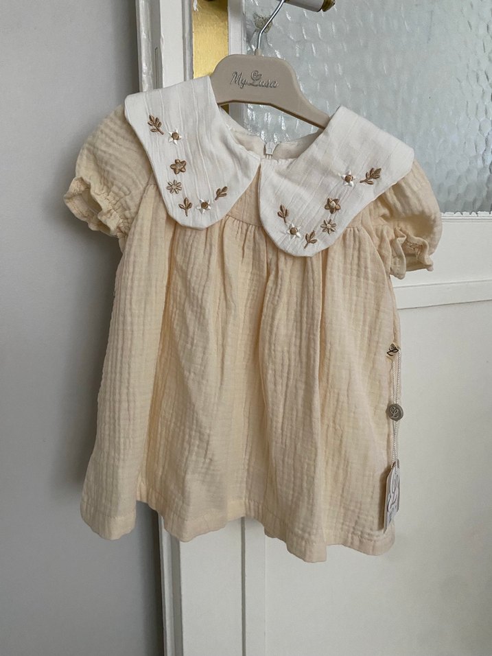 Kısa kollu, yakalı, düğmeli ve nakışlı desenlere sahip bol kesim bej keten kız çocuk elbisesi, bohem tarzda.