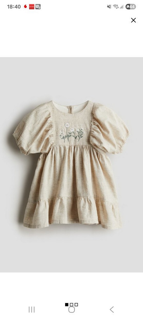 Nakışlı çiçek detaylı, fırfırlı, keten kumaştan bej renkli, kolsuz, bol kesim bohem tarzı kız elbisesi, kayık yaka.