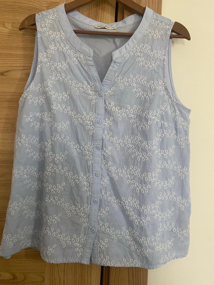 Hiç giyilmedi. Nakış detaylı mavi keten hamile bluzu, düğmeli ve kolsuzdur. V yaka ve bol kesimiyle rahat bir kullanım sunar. Midi boyda, günlük rahat stil için uygundur.