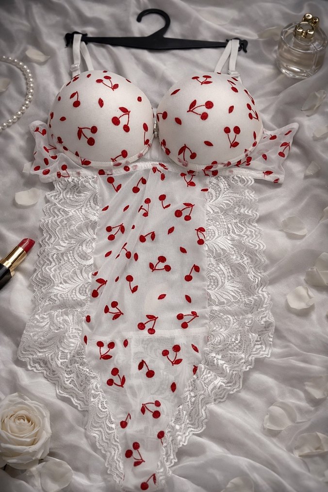 Nakışlı Kiraz Desenli Beyaz Bohem Sütyen