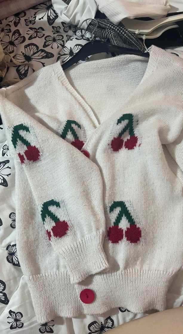 Nakışlı Kiraz Desenli Beyaz Triko Hırka