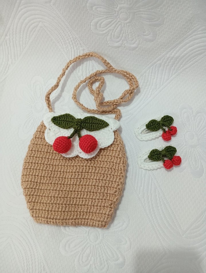Nakışlı Kiraz Desenli Örgü Çanta ve Toka Seti