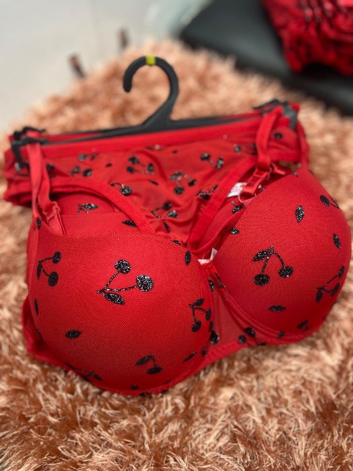 85 beden B kalıp Renkli kiraz nakışlı, kısa ve mini kesim, içi dolgulu kırmızı sütyen.
