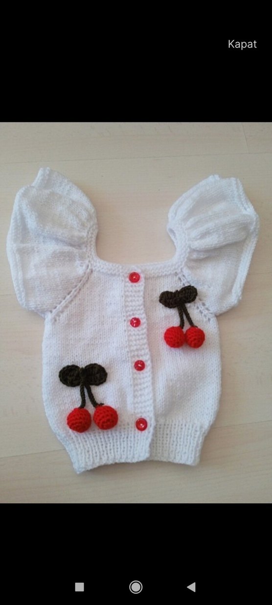 Kız çocukları için kolsuz, vücuda oturan triko süveter. Renkli nakışlı kiraz detayları ve kırmızı düğmeler bulunur. Bohem tarzda, kabarık kollu.
