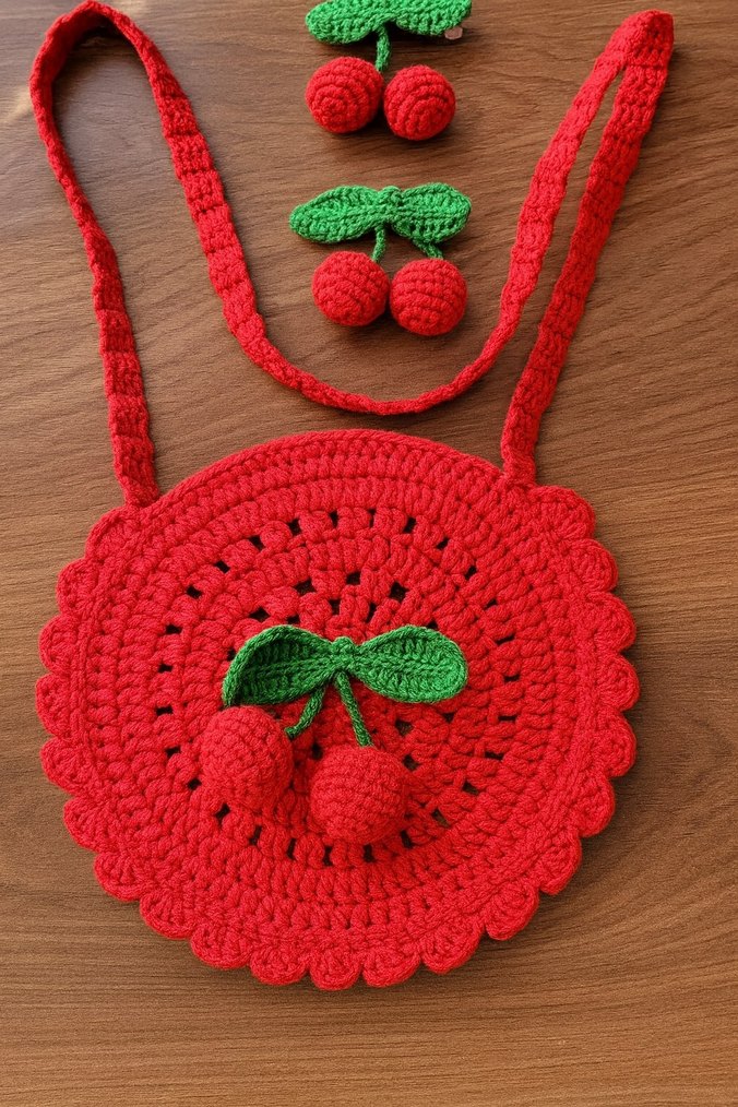 Nakışlı Kirazlı Örgü Bohem Çanta