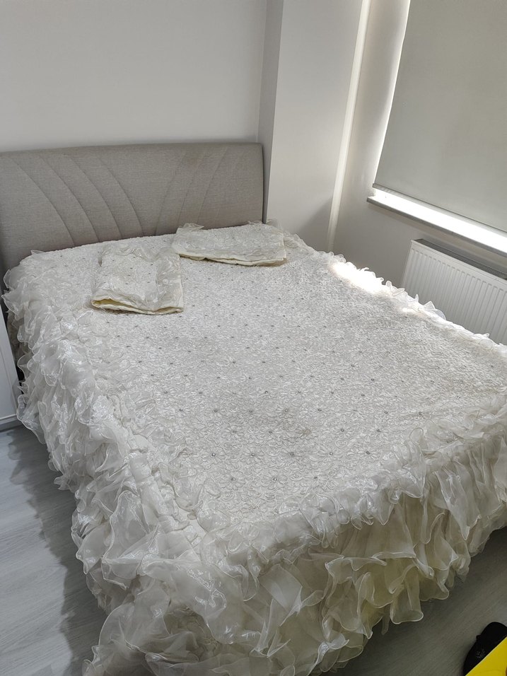 Nakışlı çiçek desenli kırık beyaz yatak örtüsü, etrafı fırfırlı ve tas detaylari vardır.Üzerinde uyumlu yastık kılıfları uyumludur.Çok az ceyiz serme kullanilmistir ufak tefek fotograflarda belirtildigi uzere lekeleri ve gorunurde 4tane taslari eksiktir. Kuru temizlemeyle halledilèbilir.