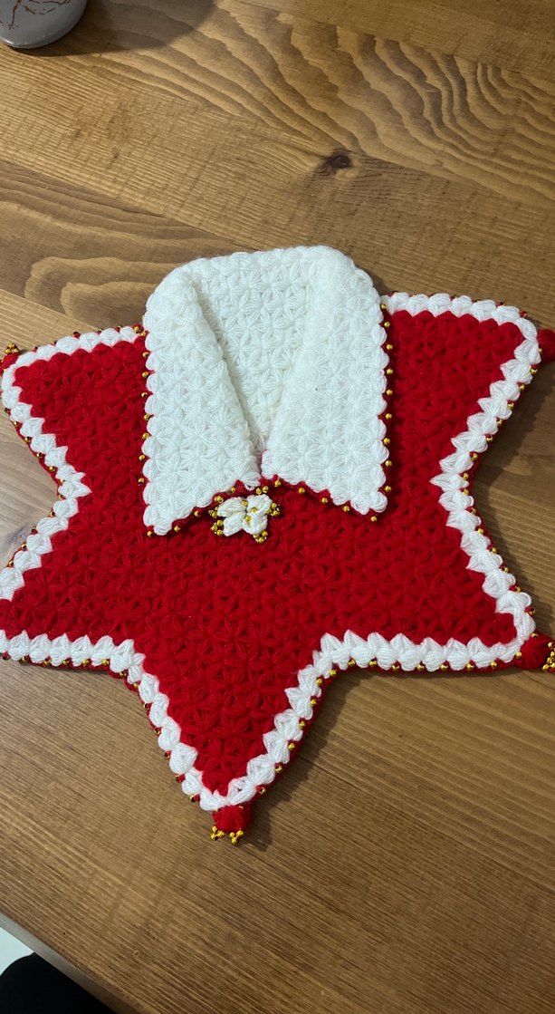 Nakışlı ve boncuk detaylı, kırmızı beyaz renklerde yıldız şeklinde . Yumuşak dokuludur.