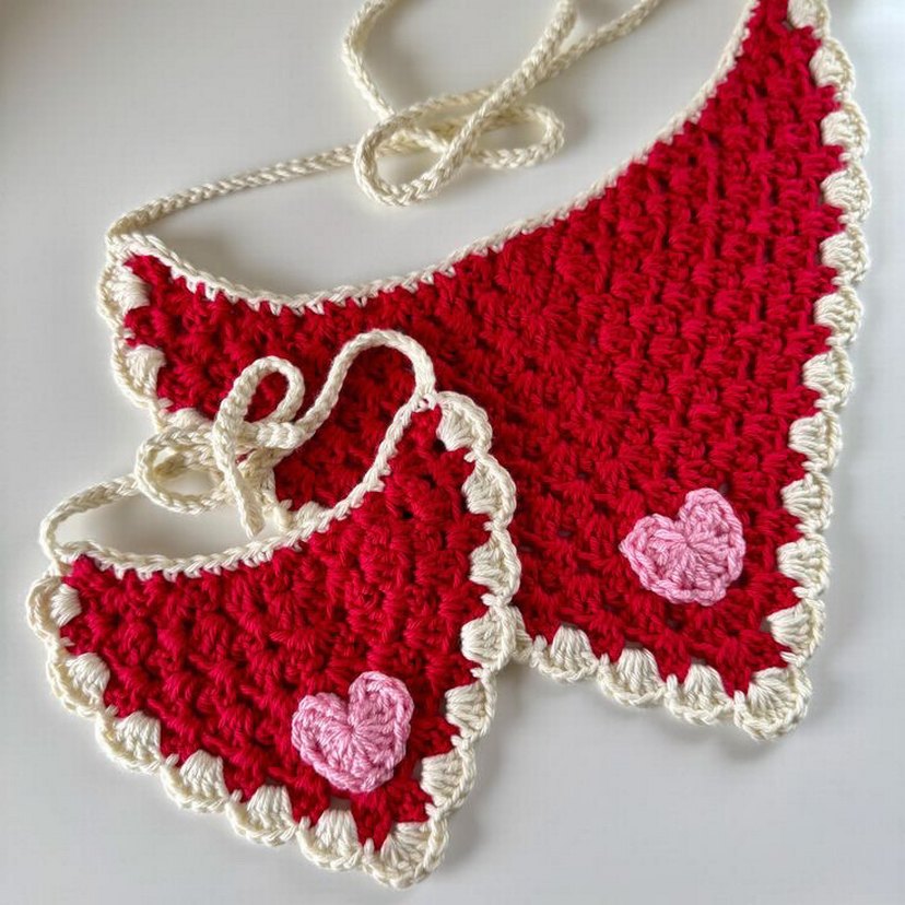 Nakışlı pembe kalpler ve krem rengi kenarları olan kırmızı bebek önlükleri, yumuşak kumaştan yapılmış ve bağlama iplerine sahiptir.