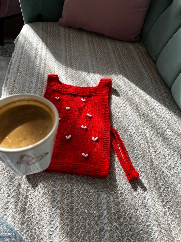 Parlak kırmızı renkte, beyaz nakışlı kalp desenli, yumuşak örme kumaştan bebek önlüğü. ❤️