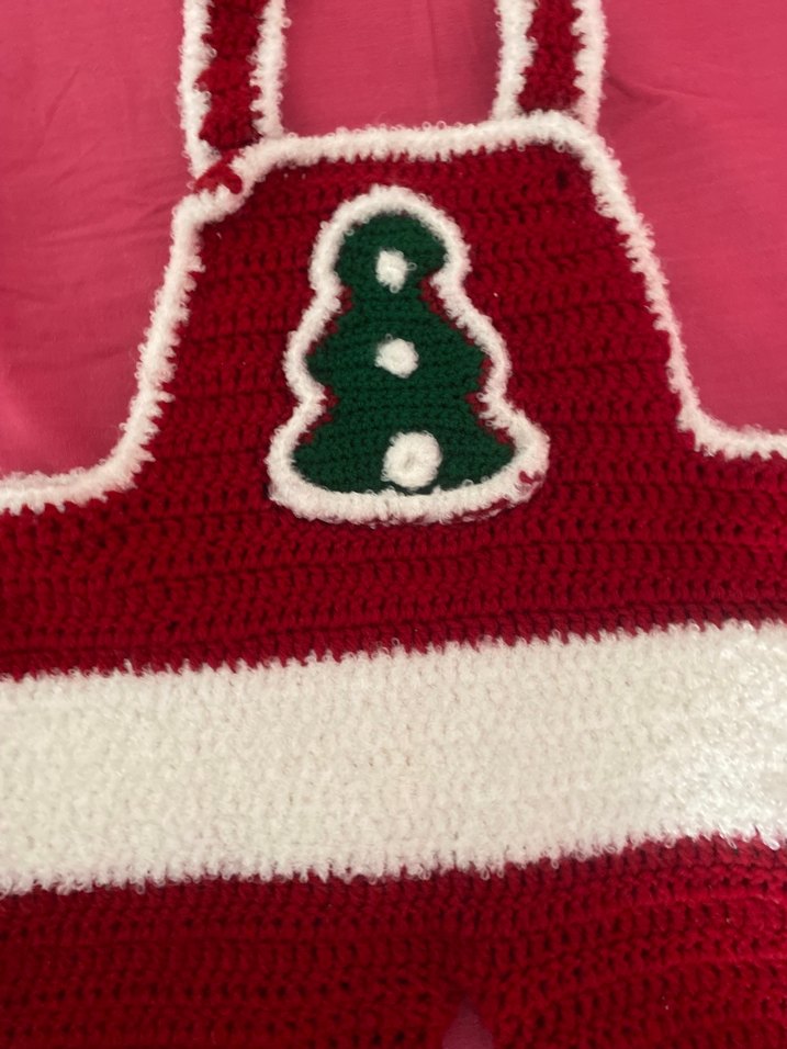 Nakışlı renkli bir yılbaşı ağacı deseni bulunan kırmızı ve beyaz dokulu bebek önlüğü. Sıcak ve el yapımı hissi verir. El yapımı tamamen bebeğim bir kere giydi o da beş dakika fotoğraf çektik sadece. Taşınacağım için elimden çıkarmak istiyorum