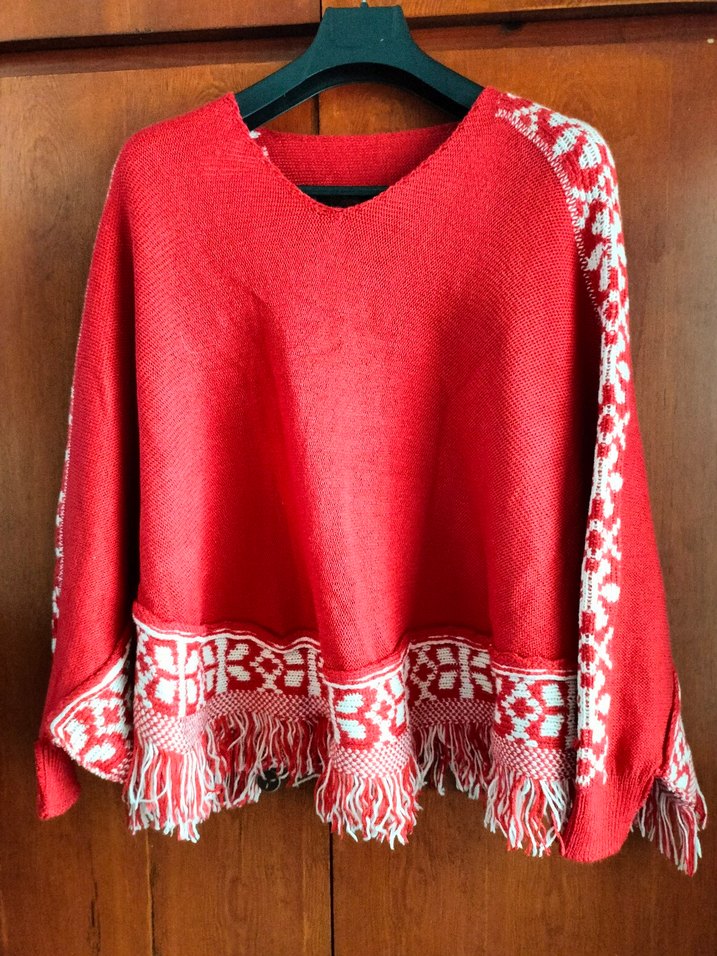 Nakışlı, uzun kollu, yuvarlak yaka kırmızı örme panço. Renkli desenler ve püsküllerle bohem, rahat midi boy.