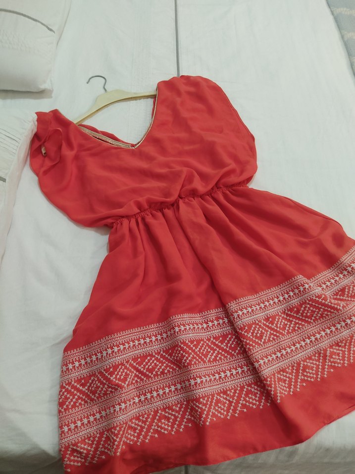 Nakışlı desenlere sahip, V yaka ve drapeli kırmızı mini elbise. Salaş kesimi ve askılı kollarıyla bohem tarzını yansıtır.