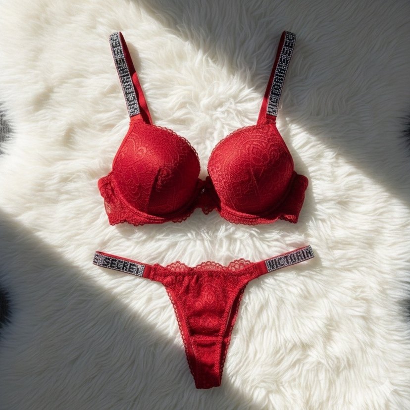 Nakışlı, renkli detaylara sahip kırmızı sütyen takımı, rahat ve bohem tarzı bir araya getirir. Markalı askılar bulunur.