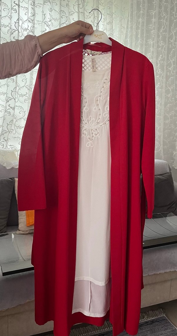 Bu kadın sabahlık, bol kesim, uzun kollu ve açık kırmızı renkte nakışlı detaylarla rahat bohem tarzını yansıtıyor.