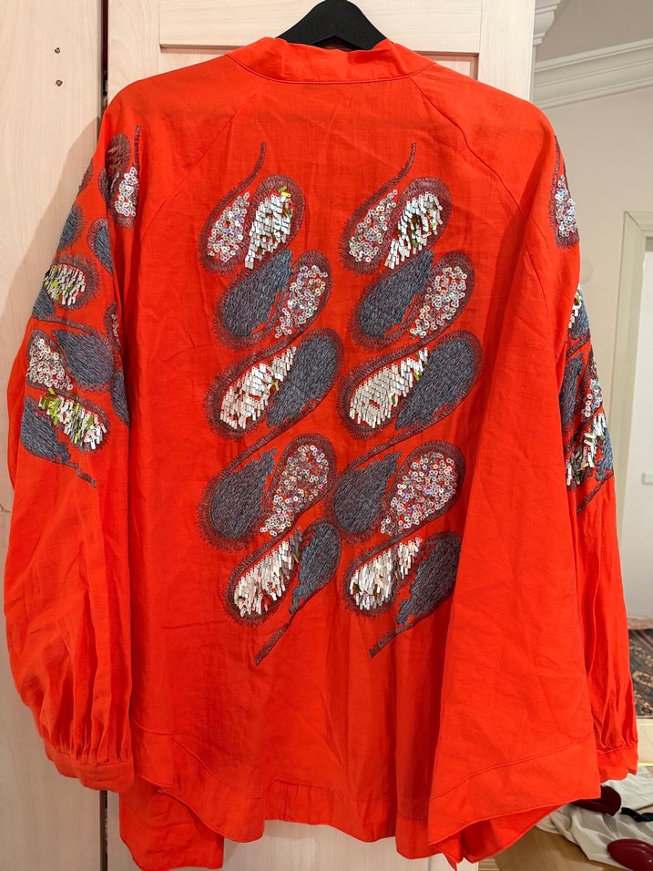 Nakışlı desenlere sahip, uzun kollu, dökümlü ve bol kesim kırmızı bohem bluz. Parlak yüzeyi ve straplez yakasıyla günlük kullanıma uygundur.