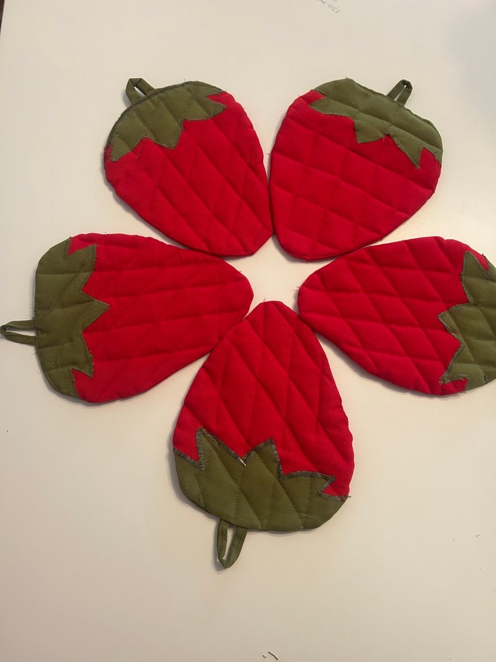 Nakışlı çilek desenli, kırmızı renkli, ısı korumalı yastıklı fırın eldivenleri. Üst kısmı yeşil yaprak detaylı. Tane fiyatıdır.