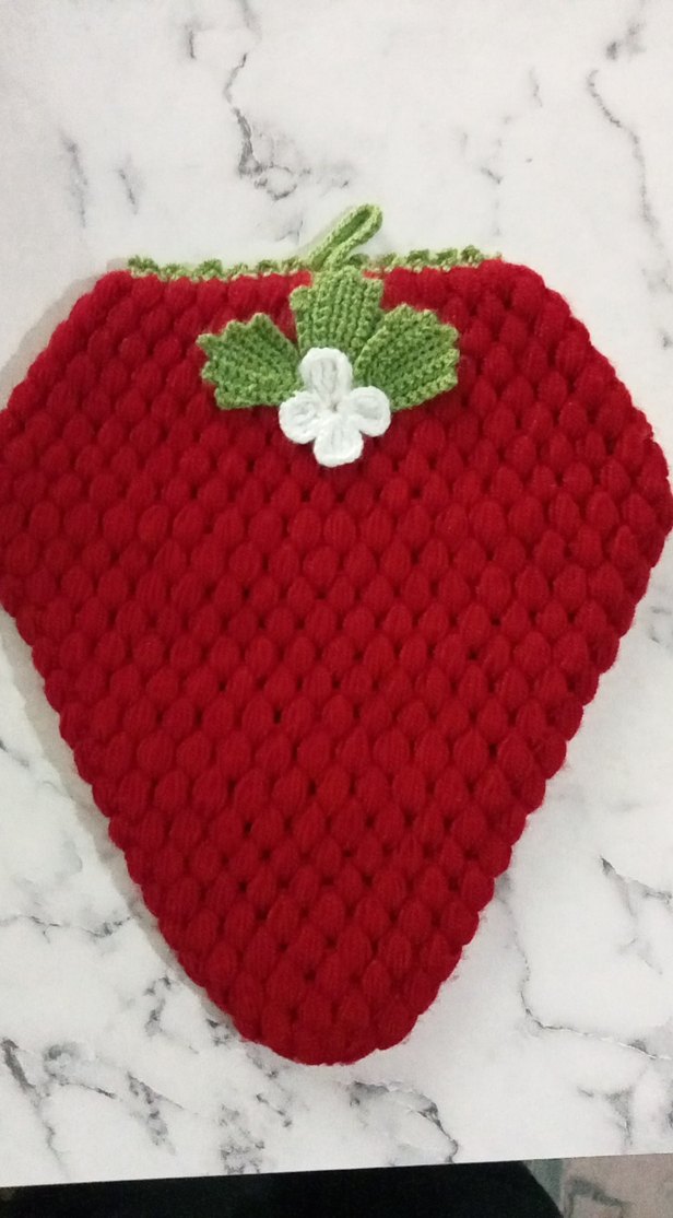 Kırmızı renkli, dokulu yüzeye sahip, yeşil yapraklar ve beyaz çiçek nakışlı, çilek şeklinde banyo lifi