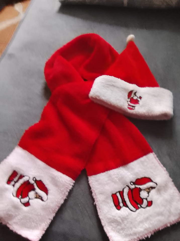 Nakışlı Noel Baba desenleriyle kırmızı renkli, beyaz detaylı çocuk atkı ve şapka takımı. Yumuşak dokusuyla sıcak tutar.