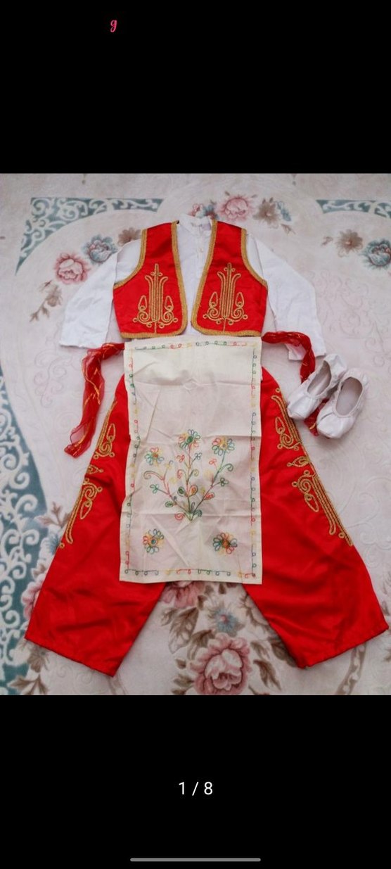 Nakışlı kırmızı çocuk kostümü, bol kesim pantolon ve kolsuz işlemeli yelek içerir. Drapeli nakışlı önlük ve beyaz ayakkabılarla tamamlanır, bohem ve retro tarzını yansıtır.