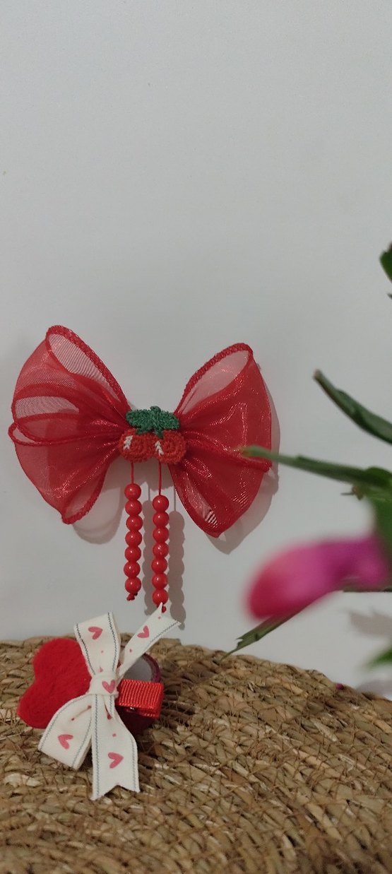 Nakışlı detaylar ve sarkan boncuklarla süslenmiş kırmızı fiyonk saç tokası, renkli ve bohem tarzda.