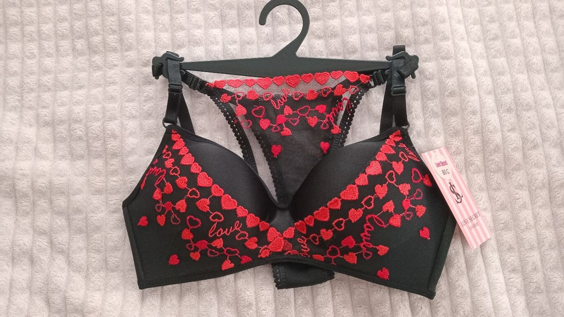 Siyah taban üzerine renkli kırmızı kalp nakışlı gotik tarzda, rahat oturan ve normal uzunlukta midi sütyen. Marka temsilidir.