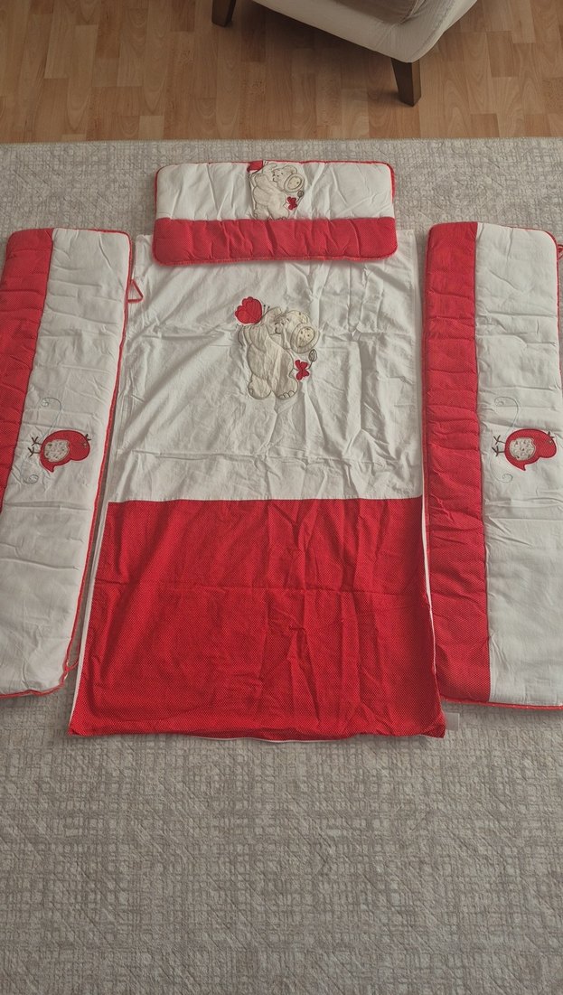 Yumuşak ve sıcak kumaştan, kırmızı ve krem tonlarında nakışlı çocuk uyku seti. Yastık ve dolgulu kılıflar içerir.