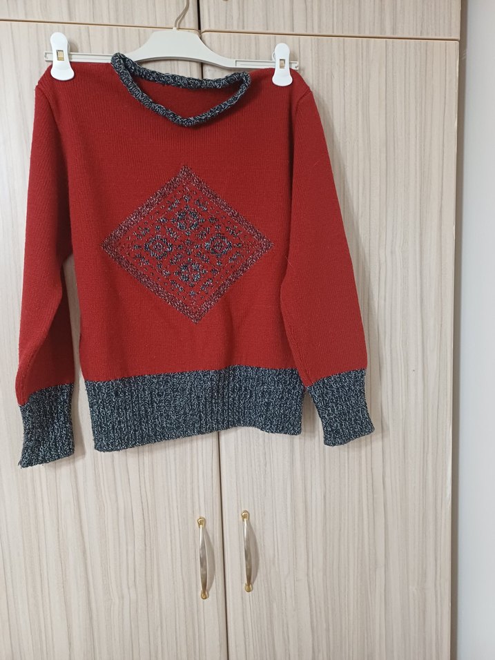 Bu kadın kazak, bol kesim, uzun kollu ve yuvarlak yakalıdır. Kırmızı dokuma kumaş üzerine gri yakalık, manşet ve etek ucu detayları bulunur. Önde nakışlı desen yer alır, rahat ve klasik bir tarza sahiptir.