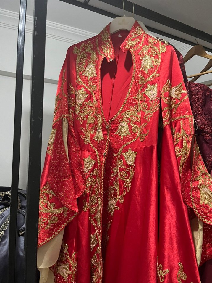 Uzun, drapeli kırmızı kına elbisesi parlak nakışlı desenlere ve kesimli yaka detayına sahiptir. Uzun kollu ve bol kesimdir, vintage klasik şıklığındadır.