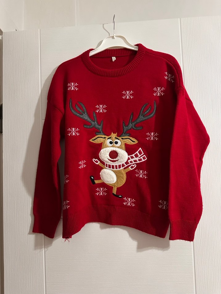 Kırmızı, uzun kollu, yuvarlak yakalı, nakışlı örgü kadın kazak. Salaş kesim, renkli detaylarla parti ve rahat sokak stili için uygun