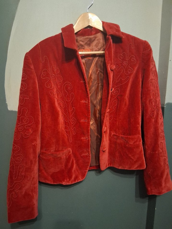 Bu kırmızı süet ceket, düğmeli ve yaka detaylıdır. Uzun kollu, nakışlı ve parlak bohem tarzıyla ofis kullanımı için uygundur. s m beden