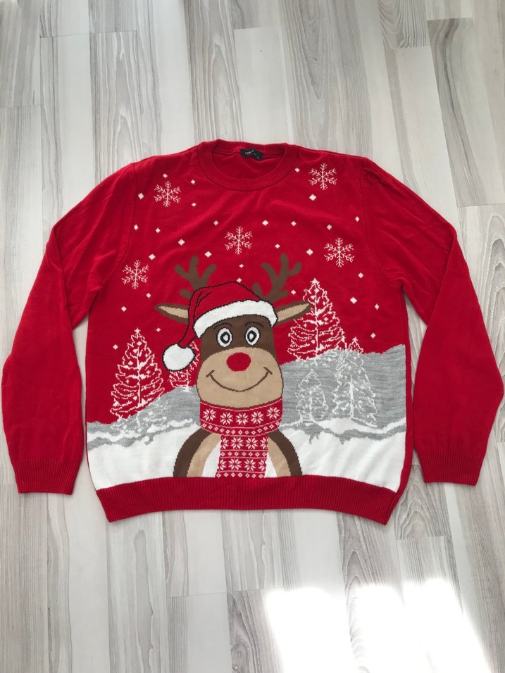 Kırmızı polar kumaştan, yuvarlak yaka ve uzun kollu, renkli nakışlı geyik ve kış desenlerine sahip rahat kesim ve normal boyda bir kazak.