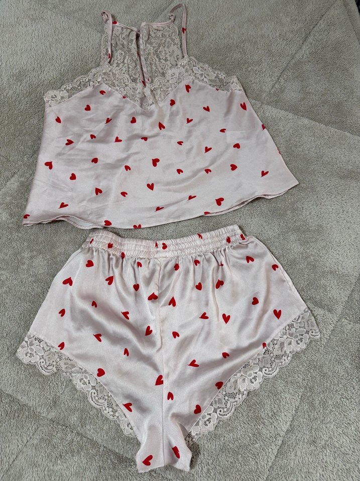 Kadınlar için nakışlı kırmızı kalp desenli, dantel detaylı, bol kesim askılı mini pijama takımı. Rahat ve bohem tarzda.