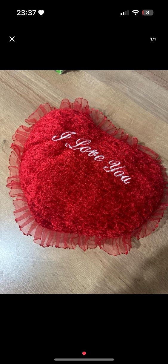 Nakışlı "I Love You" yazılı kırmızı kalp şeklinde yastık, şeffaf fırfır detaylı. ❤️