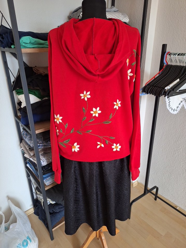 Nakışlı çiçek desenli, uzun kollu ve yuvarlak yaka kırmızı sweatshirt. Yumuşak ve sıcak kumaştan, bol kesim ve kapüşonlu bohem tarzda, günlük kullanım için uygun. swaetlari kendim dikim elde nakis yapiyorum suan elimde tek adet var beden s m l beden giyebilir