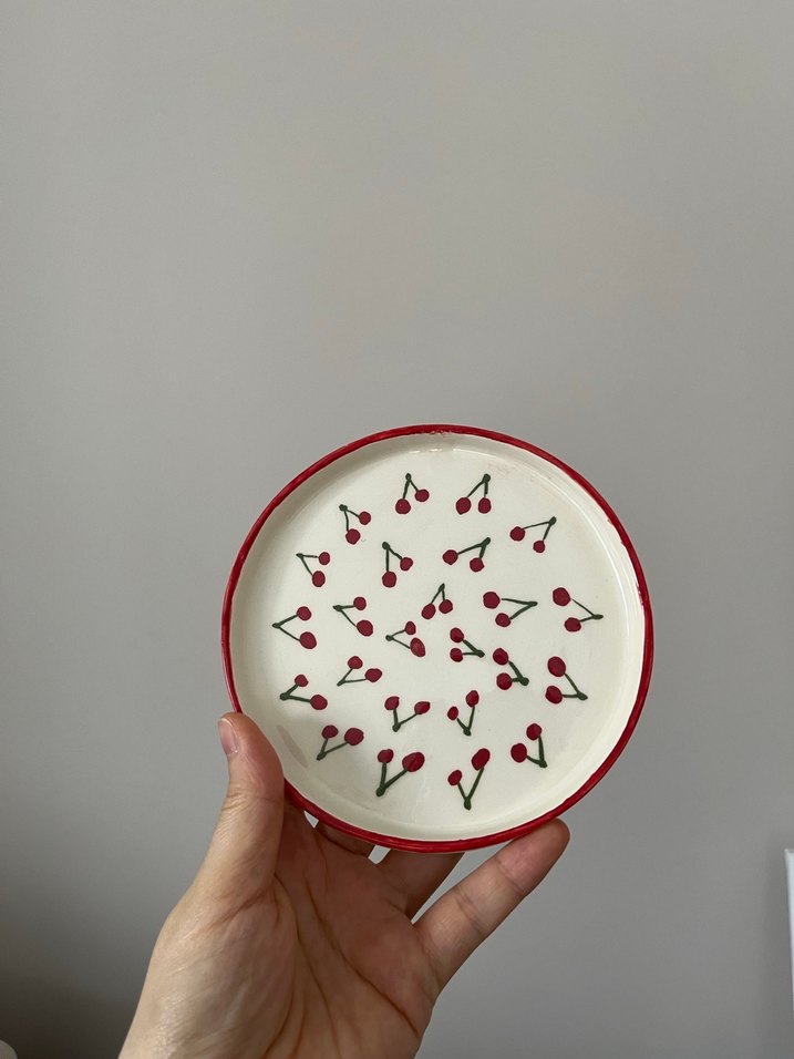 Kırmızı kenarlı, nakışlı kiraz desenli küçük yuvarlak tabak, atıştırmalıklar için uygun.