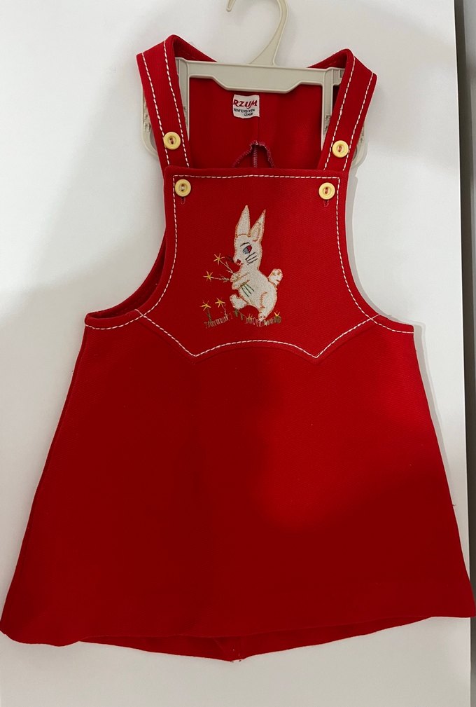 2-3 yaş için uygun Kolsuz, yuvarlak yakalı, nakışlı detaylara sahip kırmızı, sıcak ve yumuşak kumaştan yapılmış kız çocuk elbisesi. Ayarlanabilir düğmeli askıları ve renkli bohem tarzı bulunur.