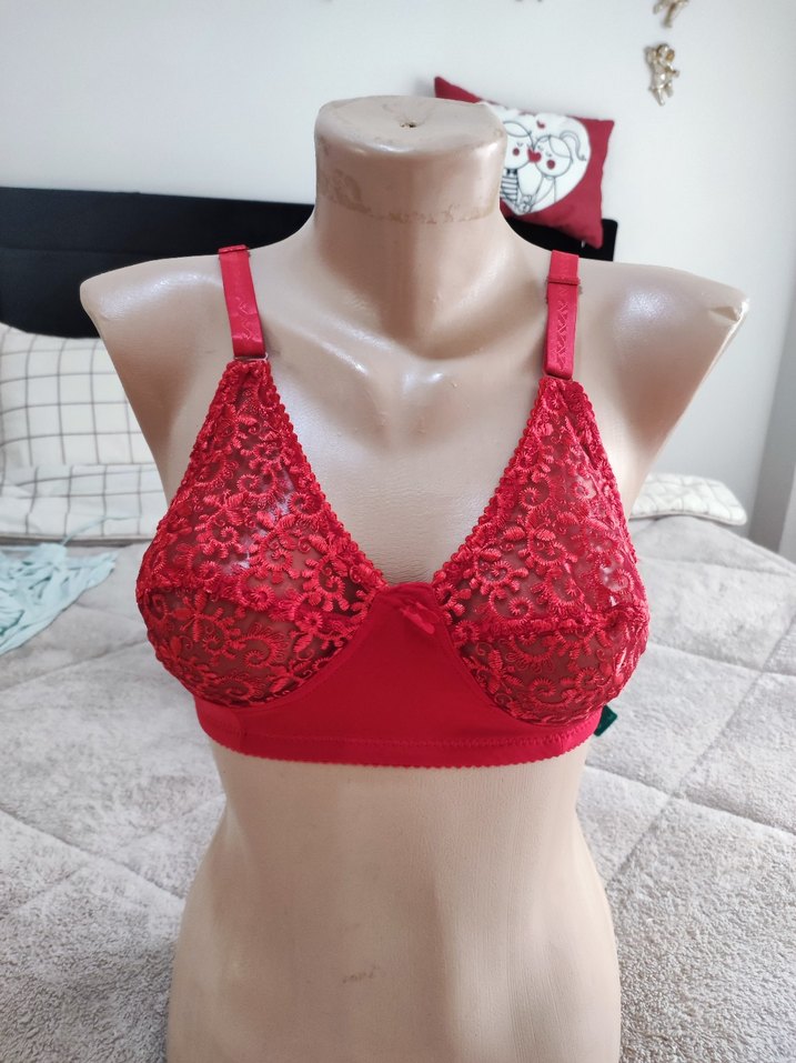 Nakışlı desenlere sahip kırmızı sütyen, konvansiyonel kesim ve normal boy uzunluğunda rahat bir tasarım sunar.