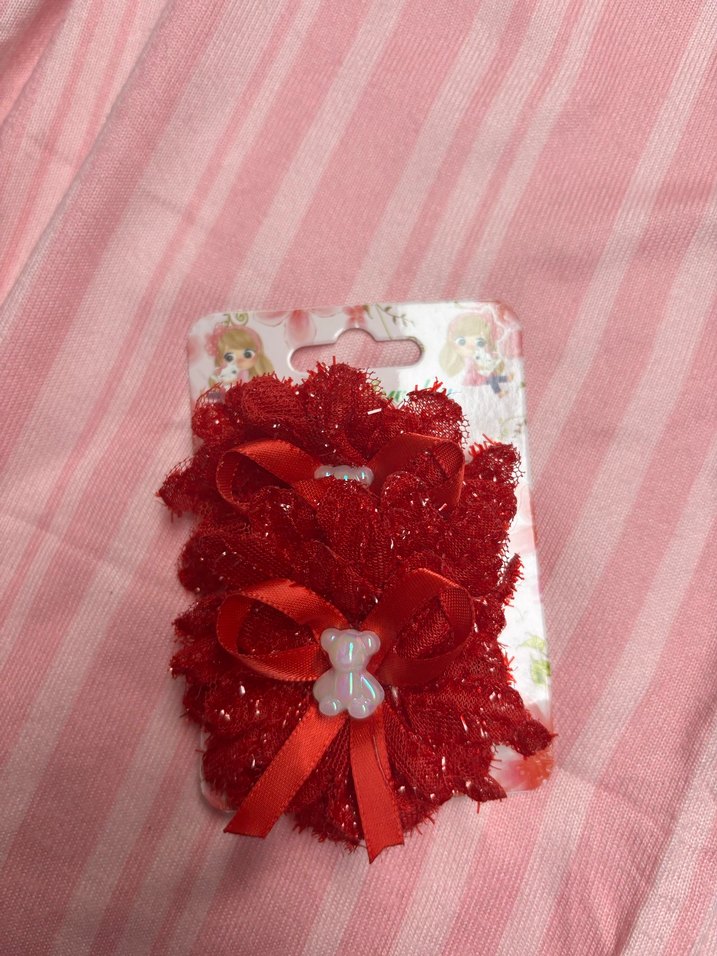 Nakışlı kırmızı saç tokaları, kurdale ve küçük ayıcık süslemeli, renkli ve farklı bir tasarıma sahip çocuk aksesuarı.