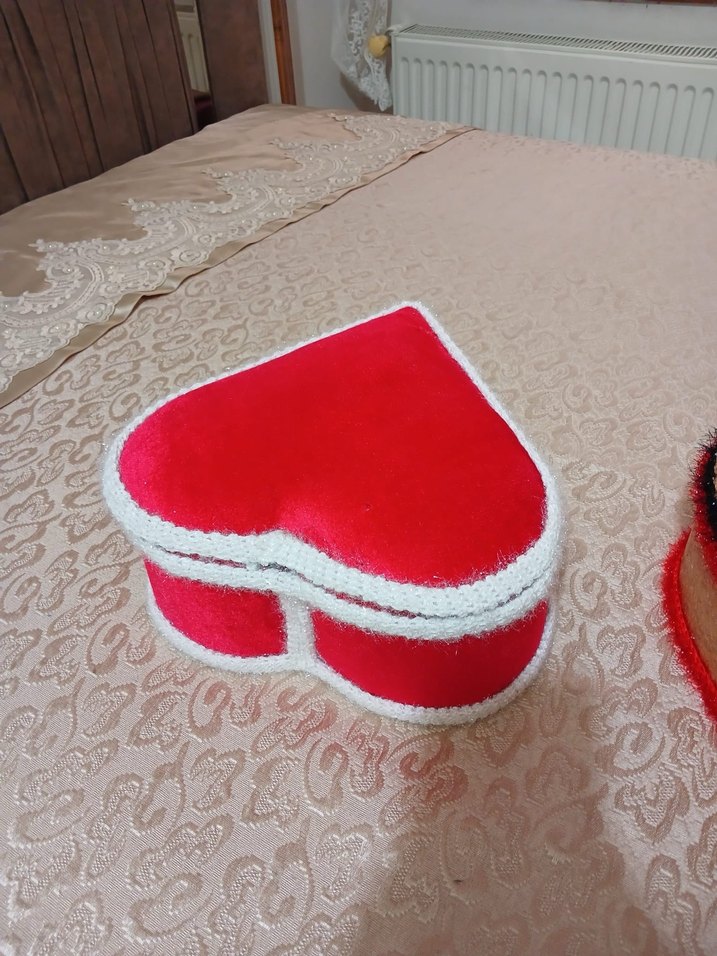 Nakışlı detaylara sahip, yumuşak ve sıcak kumaştan yapılmış renkli kalp şeklinde kutu . ❤️