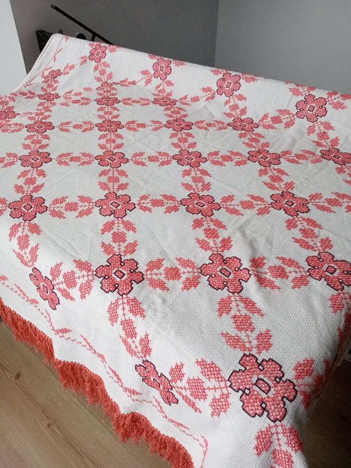 Nakışlı kırmızı çiçek desenleri ve püsküllerle süslenmiş, klasik tarzda beyaz masa örtüsü.