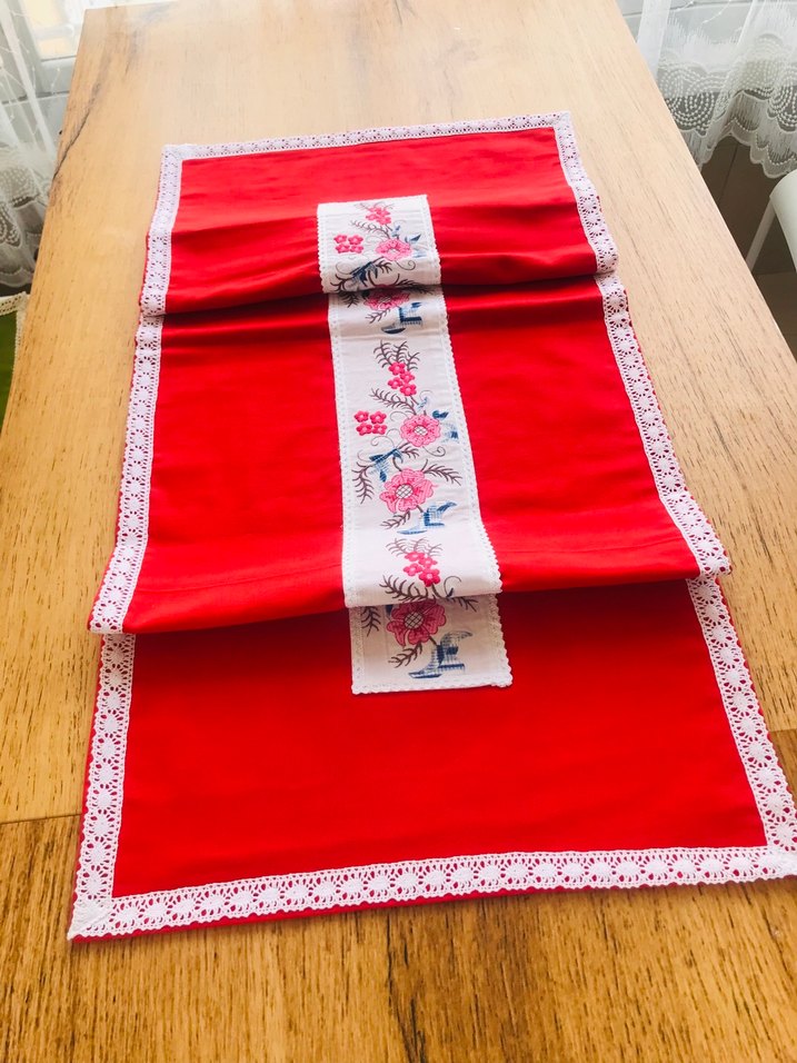 Kırmızı masa örtüsü, ortasında ve kenarlarında renkli nakışlı çiçek desenleri ve ince dantel süslemeye sahiptir. El emeği duck kumaş leke tutmaz su itici özelliği olan bi kumaştır ortası kanavicedir