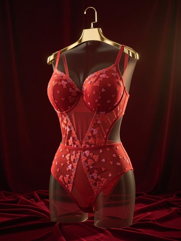 Nakışlı kalp desenleri ve transparan panellerle kırmızı midi uzunlukta, gotik ve ışıltılı tarzda bir büstiyer. ❤️