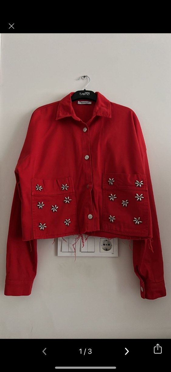 Uzun kollu, düğmeli ve yaka detaylı kırmızı mini kot ceket. Ön ceplerinde nakışlı çiçek desenleri bulunur. Salaş kesim, günlük sokak stili için uygundur.