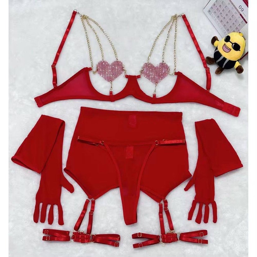 Nakışlı kalp detaylı, altın zincirli canlı kırmızı sütyen seti, eldiven ve jartiyer kayışlarıyla birlikte, sokak tarzı için uygun. ❤️
